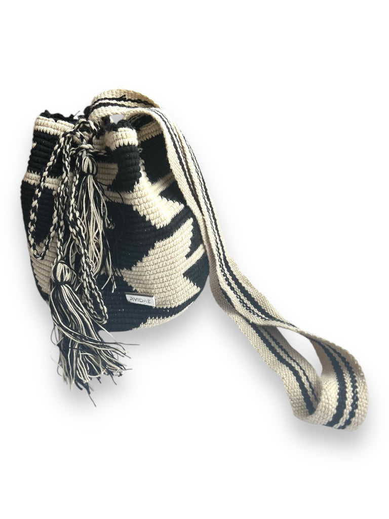 El bolso Wayuu tiene un diseño zigzag de negro y crudo con asas tejidas en colores negro y crudo.